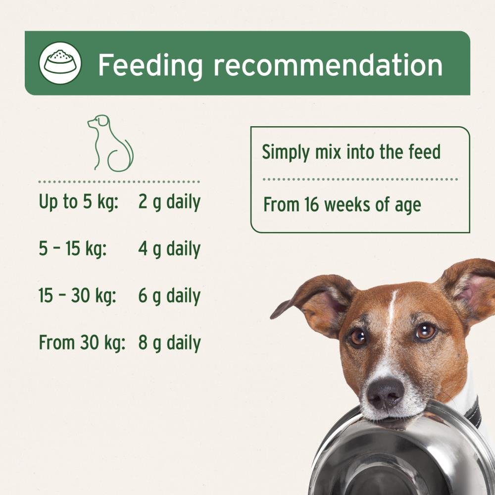 Up to 5 kg: 2 g daily | 5–15 kg: 4 g daily | 15–30 kg: 6 g daily | From 30 kg: 8 g daily. Simply mix the powder into the feed (1 measuring spoon equals approx. 2 g). Fresh drinking water should always be available.