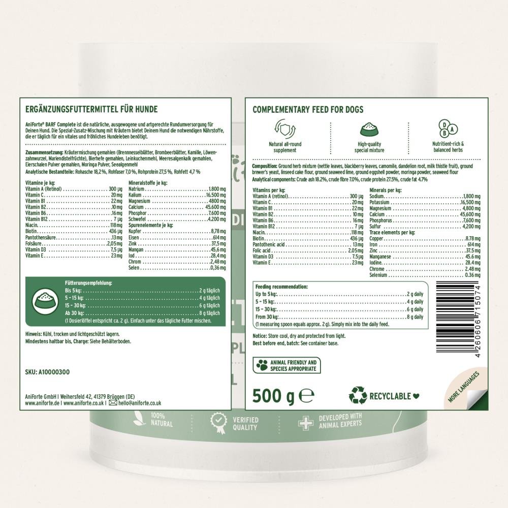 AniForte® Canine Complete is de natuurlijke, uitgebalanceerde en soortspecifieke allround verzorging voor je hond. De speciale mix van toevoegingen met kruiden voorziet je hond van de noodzakelijke voedingsstoffen die hij dagelijks nodig heeft voor een vitaal en gelukkig hondenleven. Het product bestaat uit 100% natuurlijke grondstoffen zoals kalk uit zee-algen, moutkiemen, biergist, zeewiermeel, lijnzaadmeel, eierschaalpoeder, moringa en een kruidenmengsel met mariadistelvruchten, brandnetelbladeren, braamblad, kamille en paardenbloemwortel. Het is bij uitstek geschikt als aanvulling op rauwe voeding. De eenvoudig te doseren fijne korrels kunnen simpelweg door het dagelijkse voer worden gemengd.