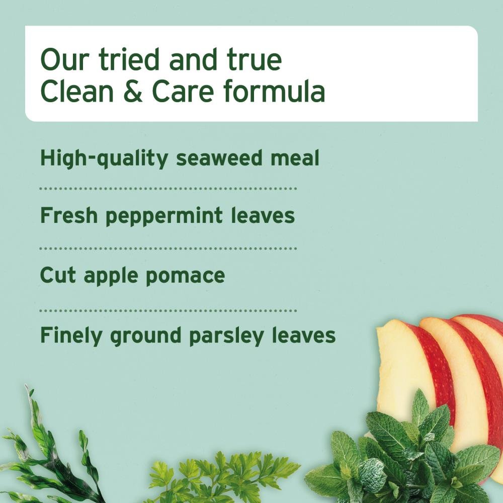 88.6% Runderpens, plantaardige glycerine, cellulosevezels, 4% natuurlijke mix (zeewiermeel, gesneden appelpulp, fijn gemalen peterselieblaadjes, fijne deeltjes pepermuntblaadjes), propolis