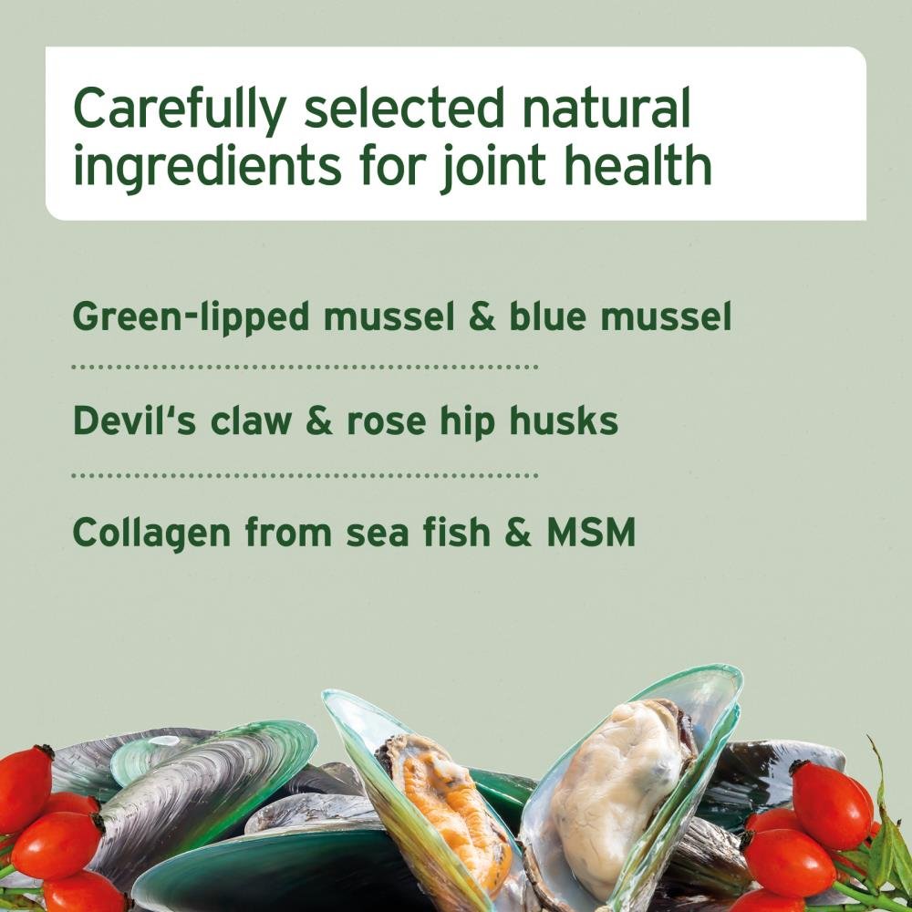 78% Kippenvlees, 3% Nieuw-Zeelands groenlipmosselpoeder, blauwe mosselvlokken (Mytilus edulis) uit MSC-gecertificeerde aquacultuur, 2% fijne delen rozenbottelschillen (0.2% vitamine C), 2% duivelsklauwpoeder, 1.5% collageenpoeder van zeevis, 1.5% omega-3 vismeel, kurkuma, 0.3% methylsulfonylmethaan (MSM), zwarte peper, cellulosevezels, plantaardige glycerine