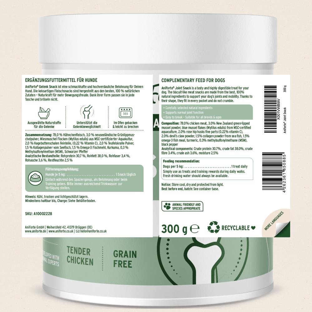 100% Natuurlijke functionele snacks voor actieve honden – goede daden moeten worden beloond! Wat is er mooier dan je hond te belonen en tegelijkertijd iets goeds voor hem te doen? Met AniForte® Gewrichtssnack doe je beide! Deze handige snacks bestaan uit een geselecteerde mix van Nieuw-Zeelands groenlipmosselpoeder, mosselvlokken, viscollageen, rozenbottel, duivelsklauw, MSM, kurkuma, zwarte peper en omega 3-vetzuren – gebundelde kracht om de gewrichtsmobiliteit van je hond te ondersteunen.