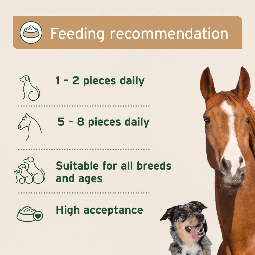 Dogs: 1–2 pieces daily | Horses & ponies: 5–8 pieces daily. Simply use as treats and training rewards during daily walks. Fresh drinking water should always be available.