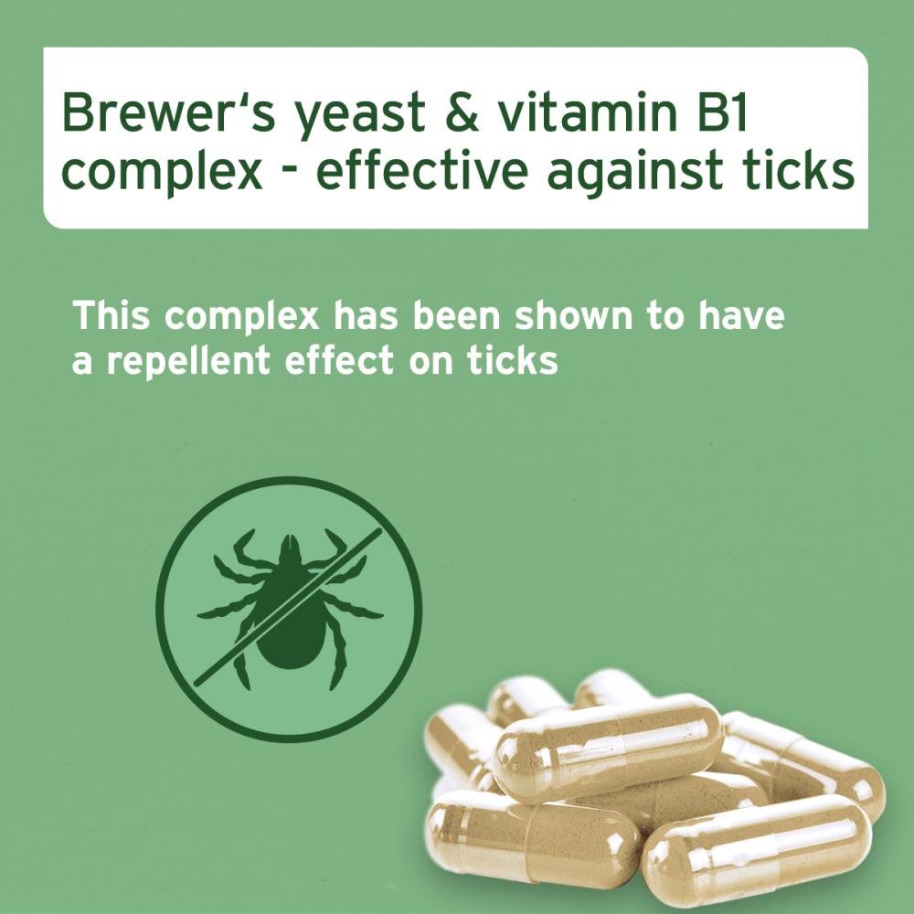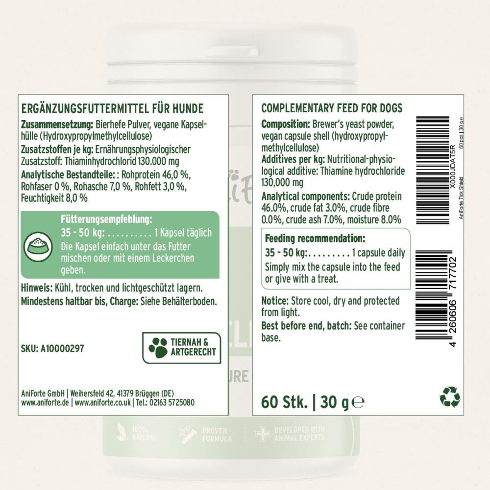 AniForte® Tekenschild helpt bij het ondersteunen van de natuurlijke stofwisseling van de huid en kunnen je hond helpen zijn natuurlijke huidbarrière te behouden. AniForte® Tekenschild bestaat uit een speciale combinatie van biergist en thiamine – ook wel bekend als vitamine B1. Vitamine B beïnvloedt verschillende stofwisselingsprocessen in het lichaam en kan onder andere zorgen voor een verandering in de natuurlijke geur van de huid – die voor mensen nauwelijks merkbaar is.