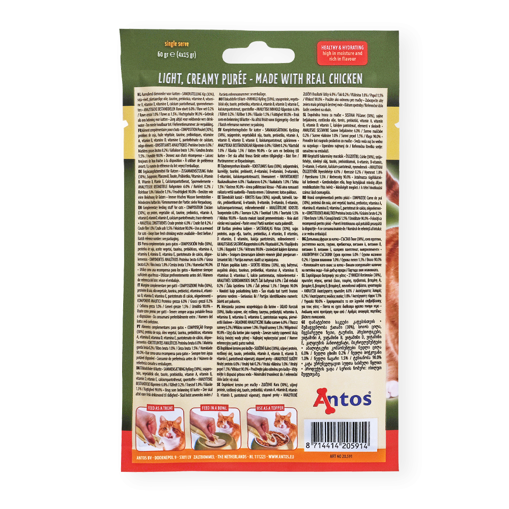Onze Kattensnacks Purée Kip worden gemaakt met lekkere ingrediënten van hoge kwaliteit. Elke heerlijke tube bevat 90% vocht, waardoor dit hydraterende, gezonde snacks zijn die je je poezenvriendjes met een gerust hart kunt voeren. We voegen hier geen granen en additieven aan toe, maar wel goede dingen, zoals taurine en verschillende vitamines, om de algemene gezondheid van je kat een boost te geven.