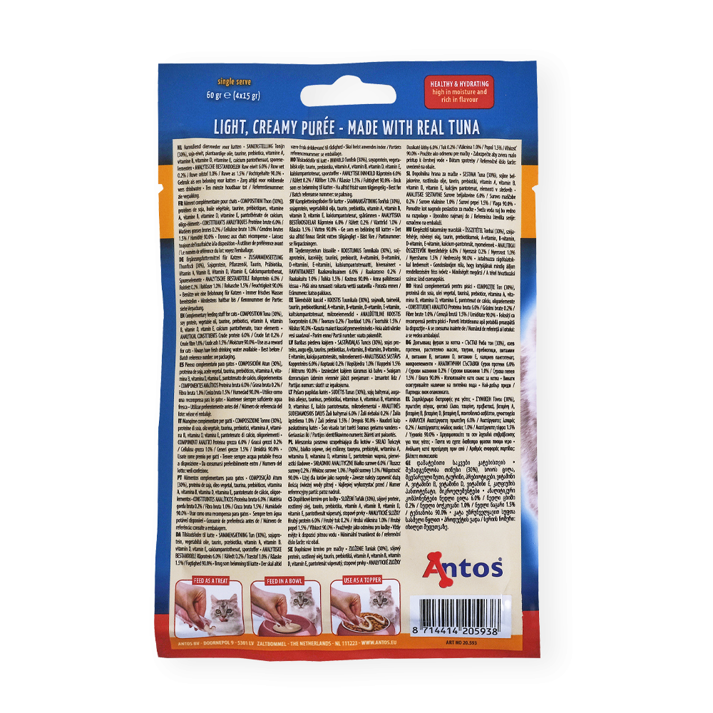 Onze Kattensnacks Purée Tonijn zullen je kat in de verleiding brengen om dichterbij te komen en te spinnen van plezier. Een voedzame, hydraterende en eiwitrijke snack, zonder kunstmatige toevoegingen. Een heerlijke en leuke knijpbare, likbare snack met echte tonijn. Bevat verschillende vitamines en taurine om de gezondheid van je kat te ondersteunen.